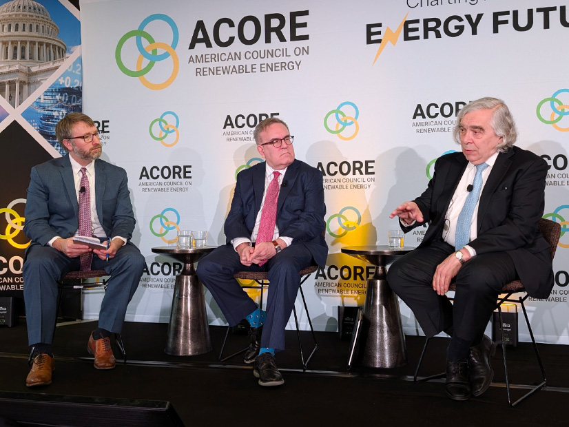 At the ACORE Policy Forum on Feb. 26, (from left) moderator Matthew Nelson, director of energy policy at Walmart, leads an on-stage conversation with former EPA Administrator Andrew Wheeler and former Energy Secretary Ernest Moniz. | © RTO Insider LLC