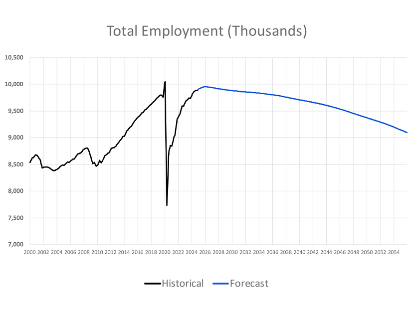 NYISO presented its assumptions for the economic and electrification trends that would drive load growth through the 2040s based on Moody’s Analytics data, which show statewide population to “significantly” decline.