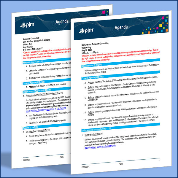 A summary of the issues scheduled to be brought to a vote at the PJM Markets and Reliability and Members committee meetings on May 28, 2020.