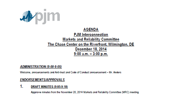 Our summary of the issues scheduled for votes at the PJM MRC on Dec. 18, 2014. Each item is listed by agenda number, description and time of discussion.