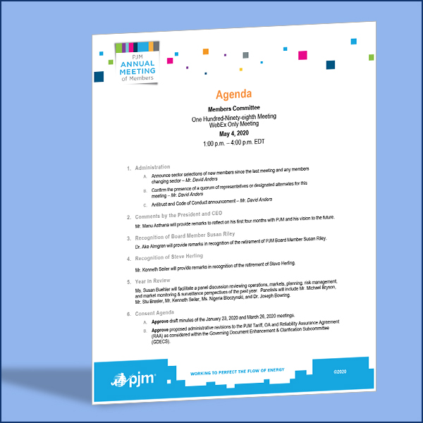 PJM's Members Committee will elect a replacement to the Board of Managers for Susan Riley and re-elect Chairman Ake Almgren and member Charles Robinson.