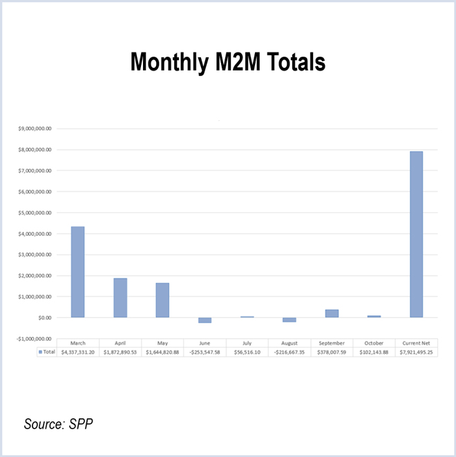SPP and MISO are on track for their second-lowest exchange of M2M funds since the process began in March.