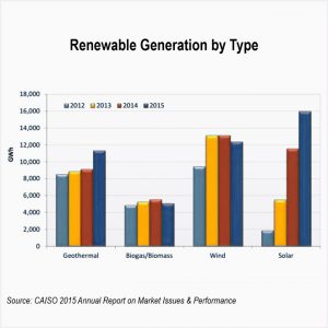 CAISO's Department of Market Monitoring reported that solar power surpassed wind in 2015, becoming the largest source of renewable generation.