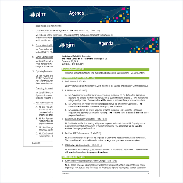 A summary of the issues scheduled to be brought to a vote at the PJM Markets and Reliability Committee on Dec. 22, 2016.