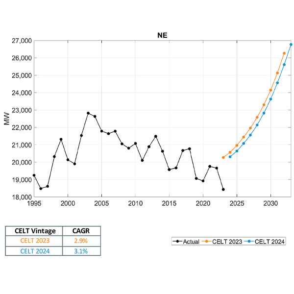 ISO-NE is predicting that New England’s peak load will increase by about 10%, and electricity consumption by 17%, by 2033, according to its 2024 Capacity, Energy, Loads and Transmission report.