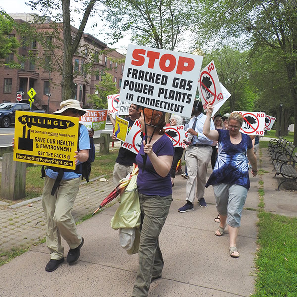 About 40 environmental activists marched in front of the headquarters of Connecticut’s DEEP to protest the approval of the Killingly Energy Center.