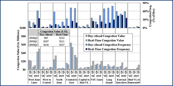 NYISO congestion costs surged in the second quarter despite lower electricity prices, gas price spreads and load levels, the Market Monitoring Unit said.