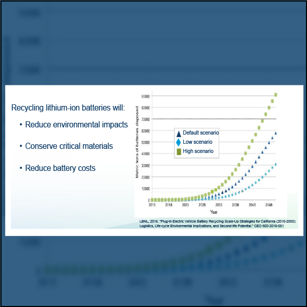 The California Energy Commission is funding battery recycling efforts to deal with the anticipated need to dispose of 60,000 metric tons by 2048.