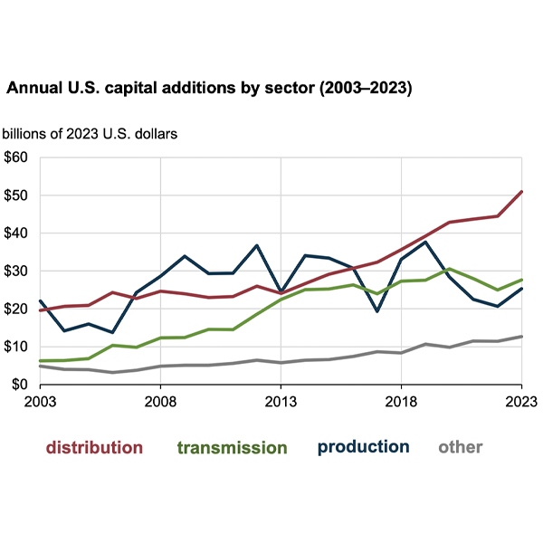 EIA data on utility capital spending over the past 20 years shows that an increase in distribution and transmission spending outweighed declines in generation spending.