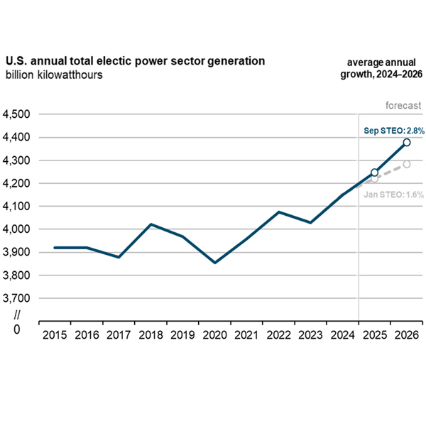 The U.S. Energy Information Administration is boosting its estimate of national power generation growth to 2.3% this year and 3.0% next year.