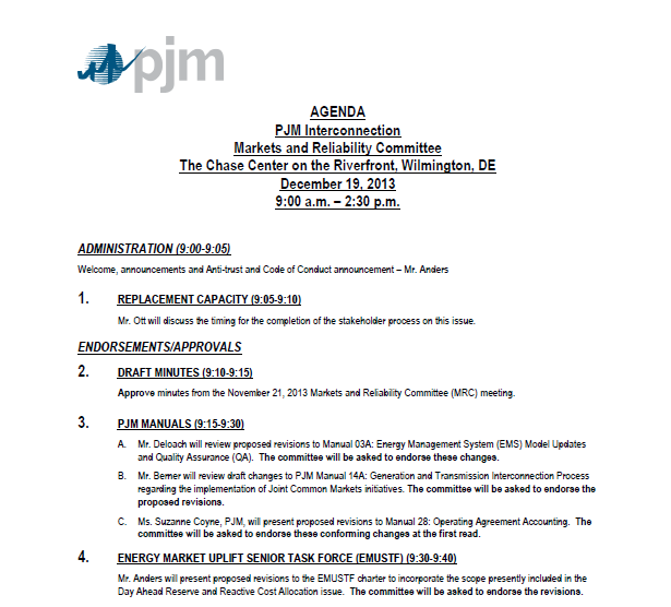 Our summary of the issues scheduled for votes at the PJM MRC on 12/19/13. Each item is listed by agenda number, description and projected time of discussion, followed by a summary of the issue and links to prior coverage.