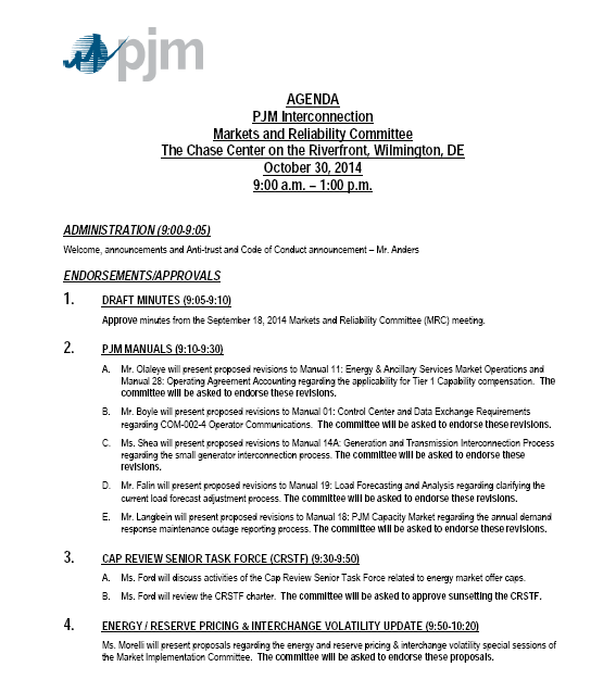 A summary of measures approved by the PJM Markets and Reliability and Members Committees on Oct. 30, 2014.
