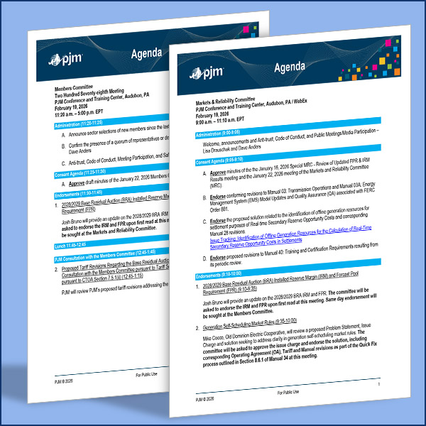 A summary of the agenda items scheduled to be brought to a vote at the PJM Markets and Reliability Committee and Members Committee meetings.