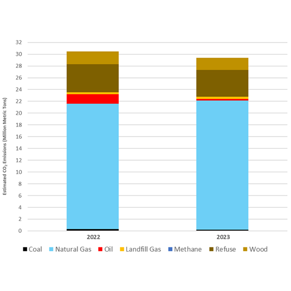 New England power system emissions decreased by about 3.6% in 2023 compared to 2022, according to the underlying data from ISO-NE COO Vamsi Chadalavada’s monthly report.