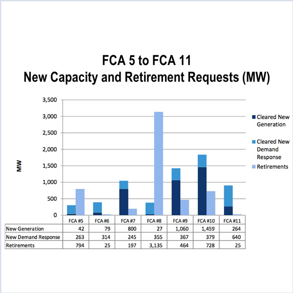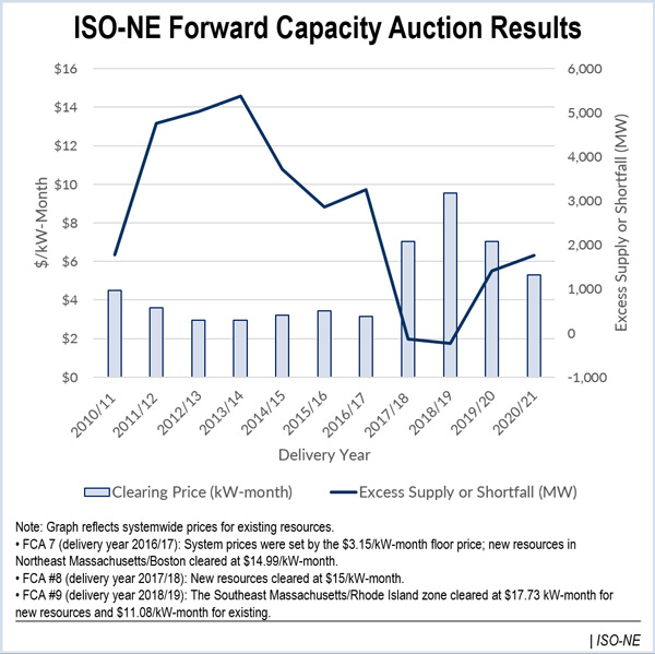 Prices dropped by one-quarter to $5.30/kW-month in the ISO-NE 11th Forward Capacity Auction, the lowest since 2013.