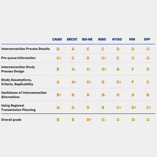 Advanced Energy United has released a scorecard that ranks the seven domestic ISO/RTOs on their generator interconnection processes, finding room for improvement in every one.
