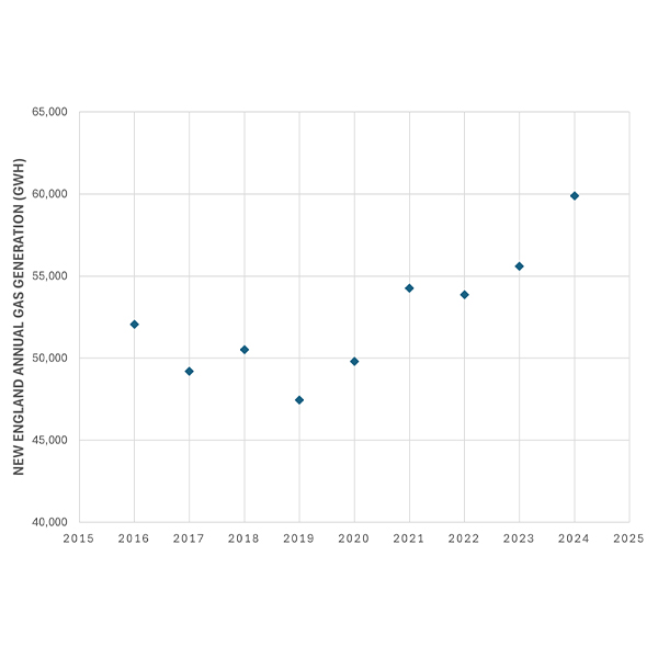 As overall power production ticked up in New England in 2024, natural gas generation reached its highest annual total in the region’s history, accounting for over 55% of all generation and 51% of net energy for load, according to new data from ISO-NE.