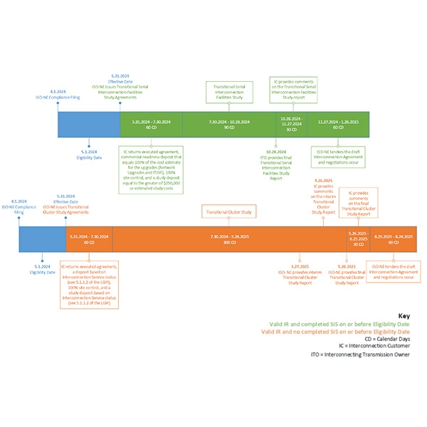 ISO-NE outlined key components of tariff changes it plans to comply with Order 2023, including cluster timelines and storage study assumptions.