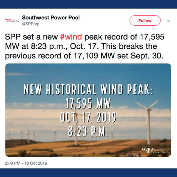SPP extended its record for wind energy production to 17,595 MW on Oct. 17, the RTO announced.