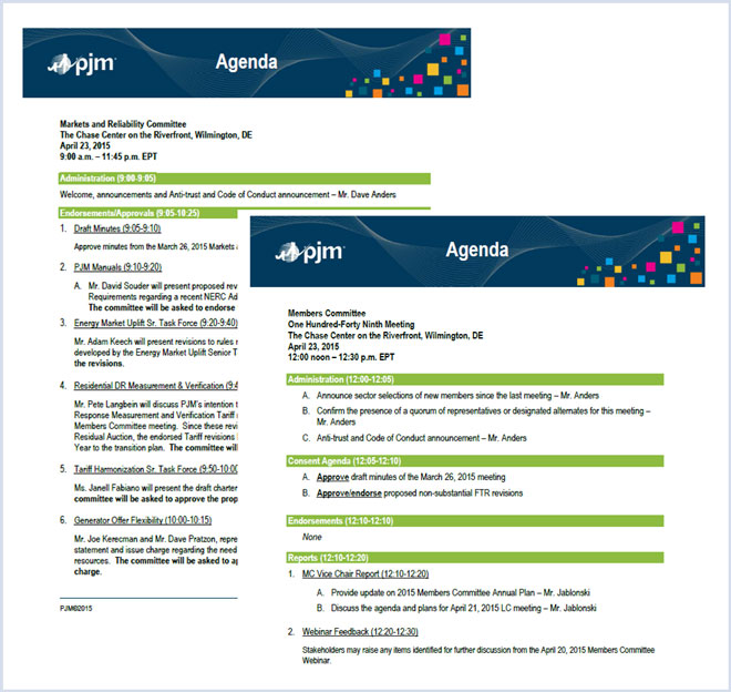 Our summary of the issues scheduled for votes at the PJM MRC and MC on 04/23/15. Each item is listed by agenda number, description and projected time of discussion, followed by a summary of the issue and links to prior coverage.