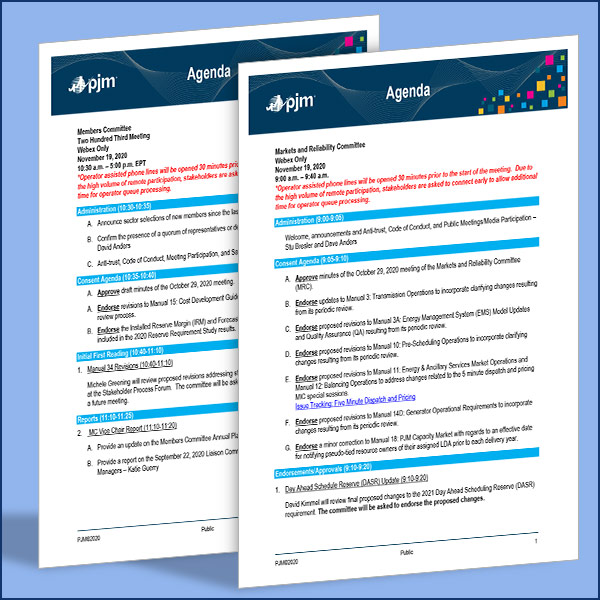 A summary of the agenda items scheduled to be brought to a vote at the PJM Markets and Reliability Committee and Members Committee meetings.