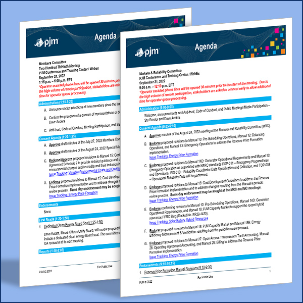 Here's a summary of the agenda items scheduled to be brought to a vote at the PJM Markets and Reliability Committee and Members Committee meetings Wednesday.