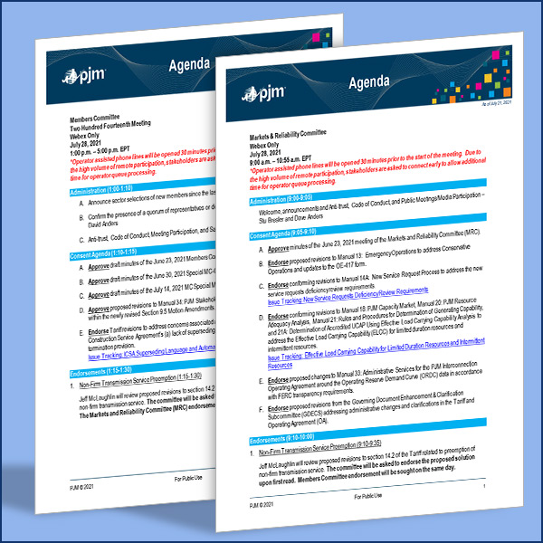 A summary of the issues scheduled to be brought to a vote at the PJM Markets and Reliability and Members committee meetings on July 28, 2021.