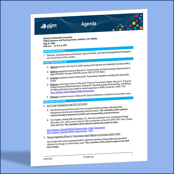 PJM’s Markets and Reliability Committee will be asked to endorse revisions to the RTO's tariff, Reliability Assurance Agreement and Operating Agreement.