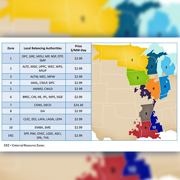 MISO’s 7th annual capacity auction cleared at $2.99/MW-day in all but 1 zone, a significant decline compared with last year’s nearly uniform $10 price.