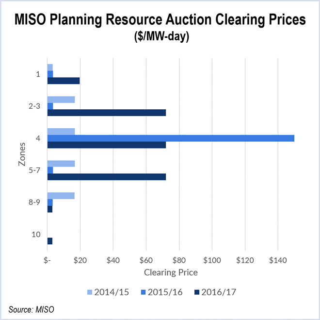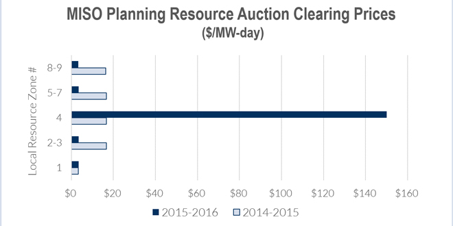 The annual MISO capacity auction again produced disparate, roller coaster results, with prices in 3 zones quintupling versus last year and Zone 4 dropping.