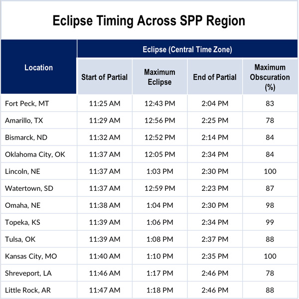 Next week’s total solar eclipse will not disrupt SPP operations despite 100% obscuration levels in parts of its 14-state footprint.