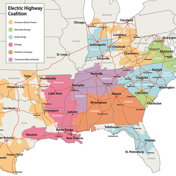 Six utilities in the Southeast, including AEP, Duke and TVA, have banded together with a plan to create “a seamless network” of fast-charging EV stations.