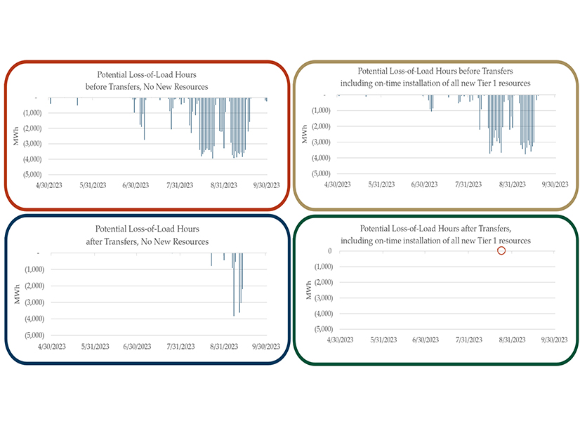 A chart shows hours at risk of shortfalls in California-Mexico this summer without new imports and/or resources (red, gold and blue) and with planned new resources and imports (green). | WECC